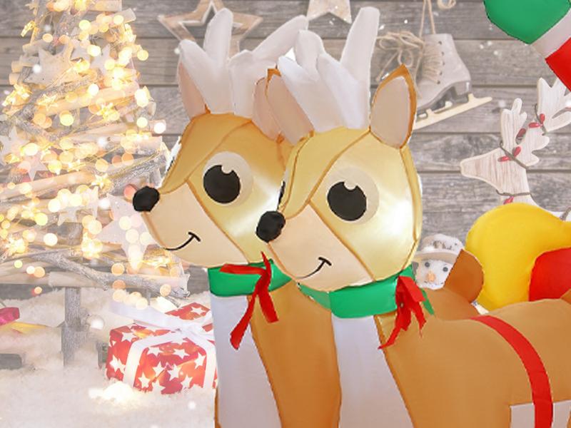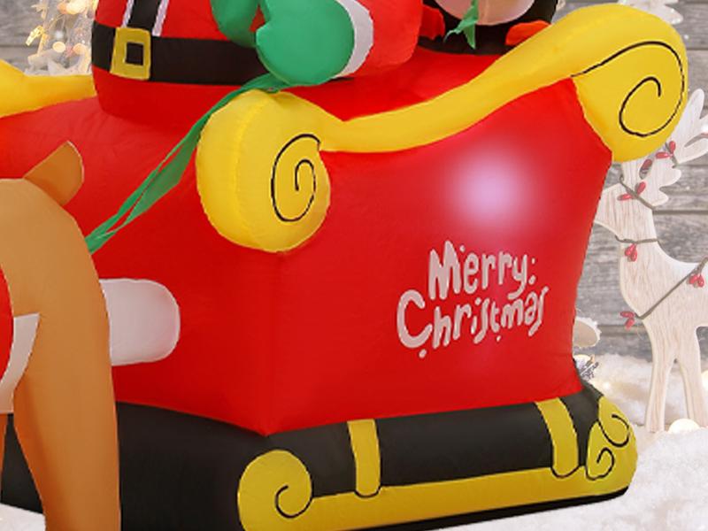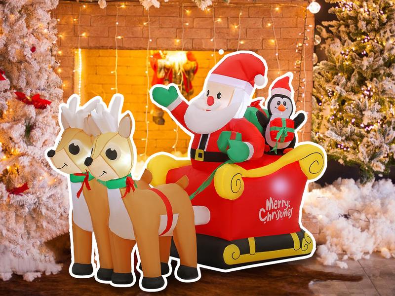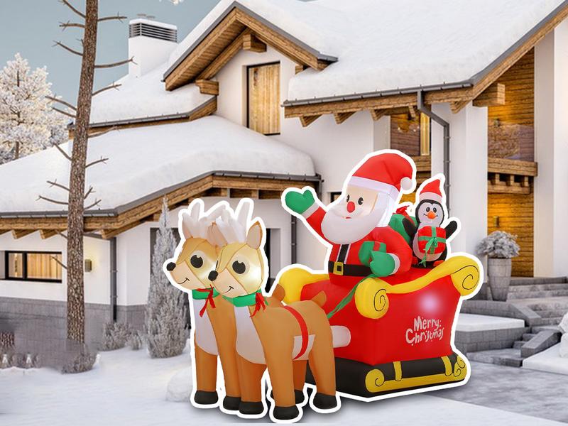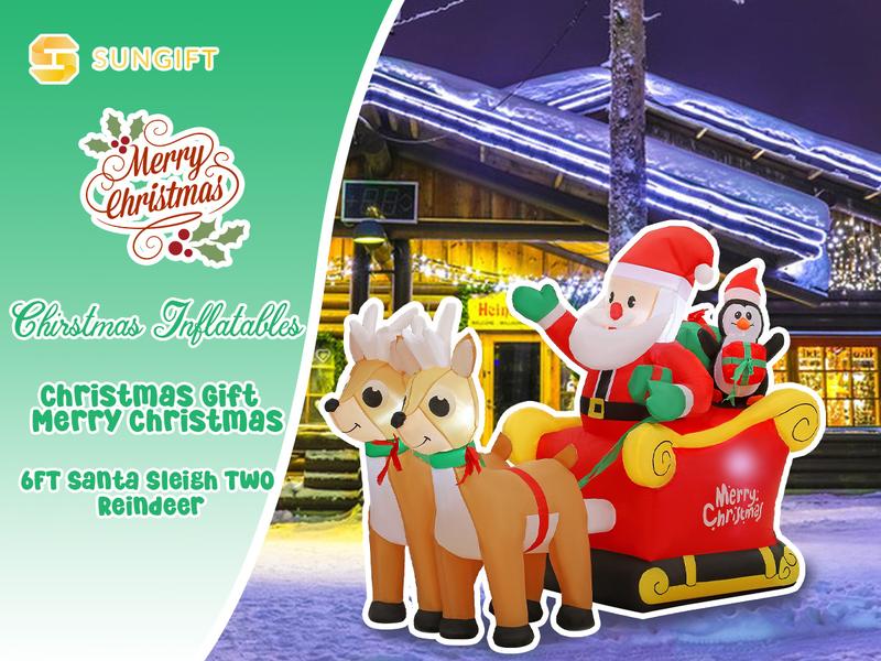 Transform your holiday decorations with SUNGIFT's 6 feet long Christmas inflatable! Featuring Santa Claus and his reindeer, it's eye-catching and whimsical. Santa sits on his sleigh, pulled by two adorable reindeer. Add a festive touch to your yard, garden, or lawn. Perfect for Christmas parties and festive decor.